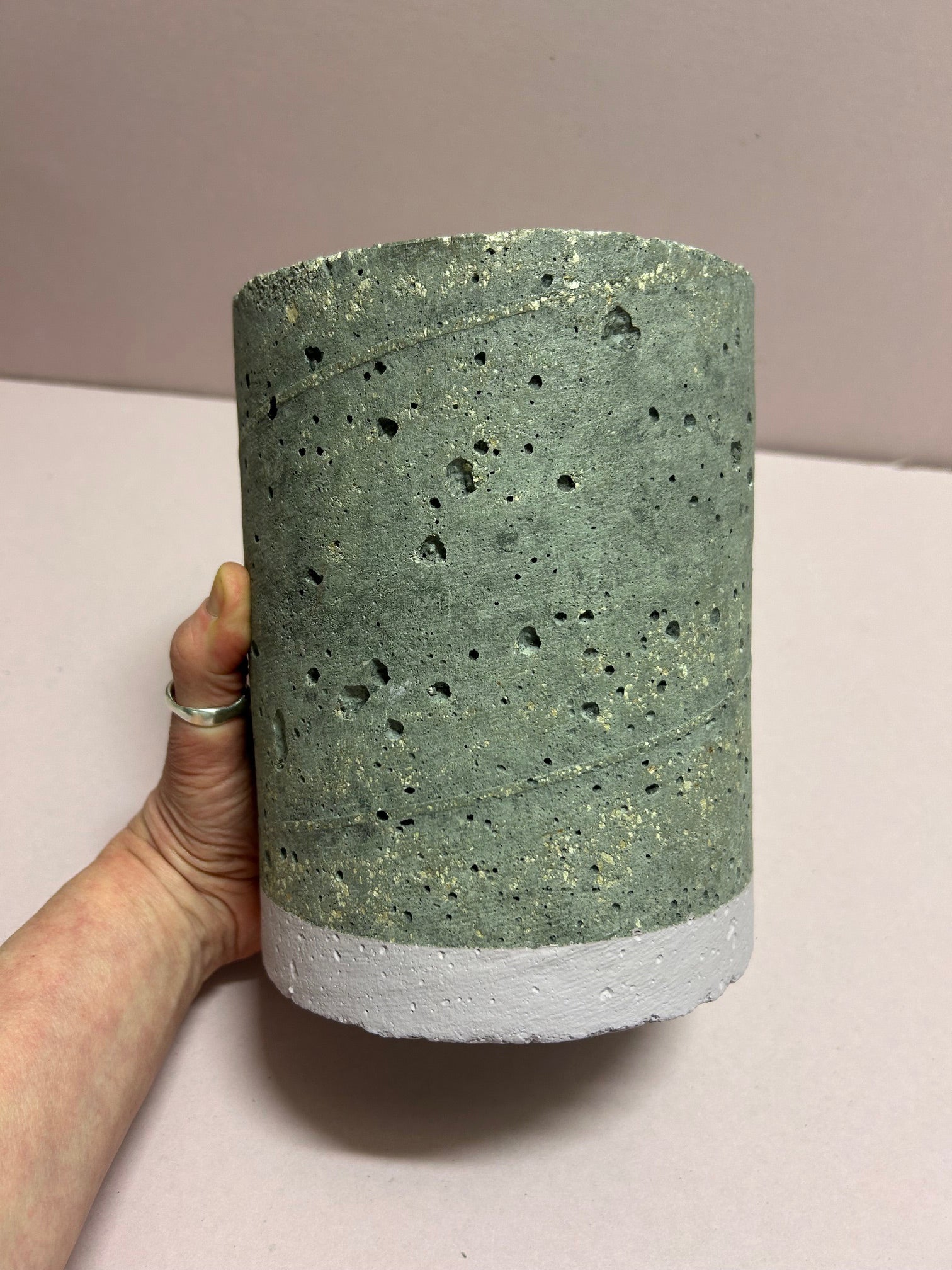 Handcrafted concrete cylinder pot to keep your favourite tools or a plant. A lightweight product perfect for your home. Pink stripe at the bottom and mauve inside Height 18cm & Diameter 15cm. Now 1/2 price