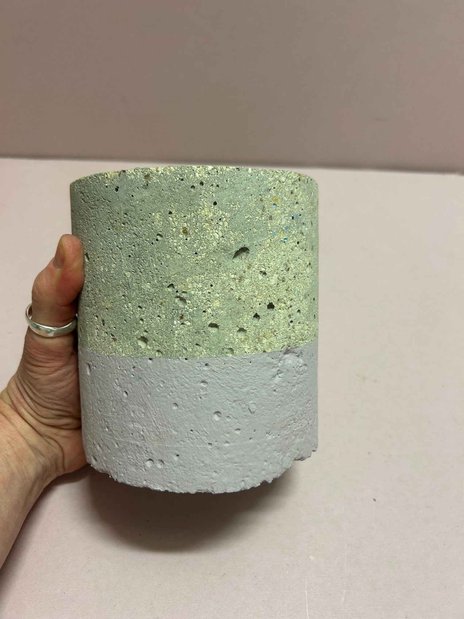 Handcrafted concrete cylinder pot to keep your favourite tools or a plant. A lightweight product perfect for your home. Pink bottom and pink inside. Height 13.5cm & Diameter 12.5cm. Now 1/2 price